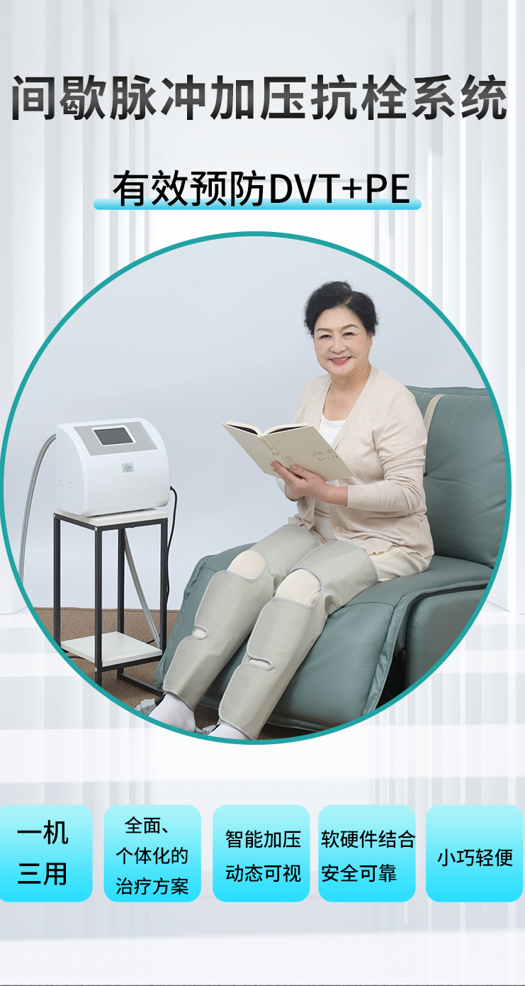 通過多腔體充氣氣囊有次序、有節(jié)律地進行充氣膨脹擠壓和放氣,形成對肢體的循環(huán)壓力。這種循環(huán)壓力可促進靜脈回流,加強動脈灌注,改善血液循環(huán)和組織液循環(huán)。能防止凝血因子聚集及對血管內膜的粘附,增加纖溶系統(tǒng)的活性,從而達到預防深靜脈血栓、消除水腫的效果。